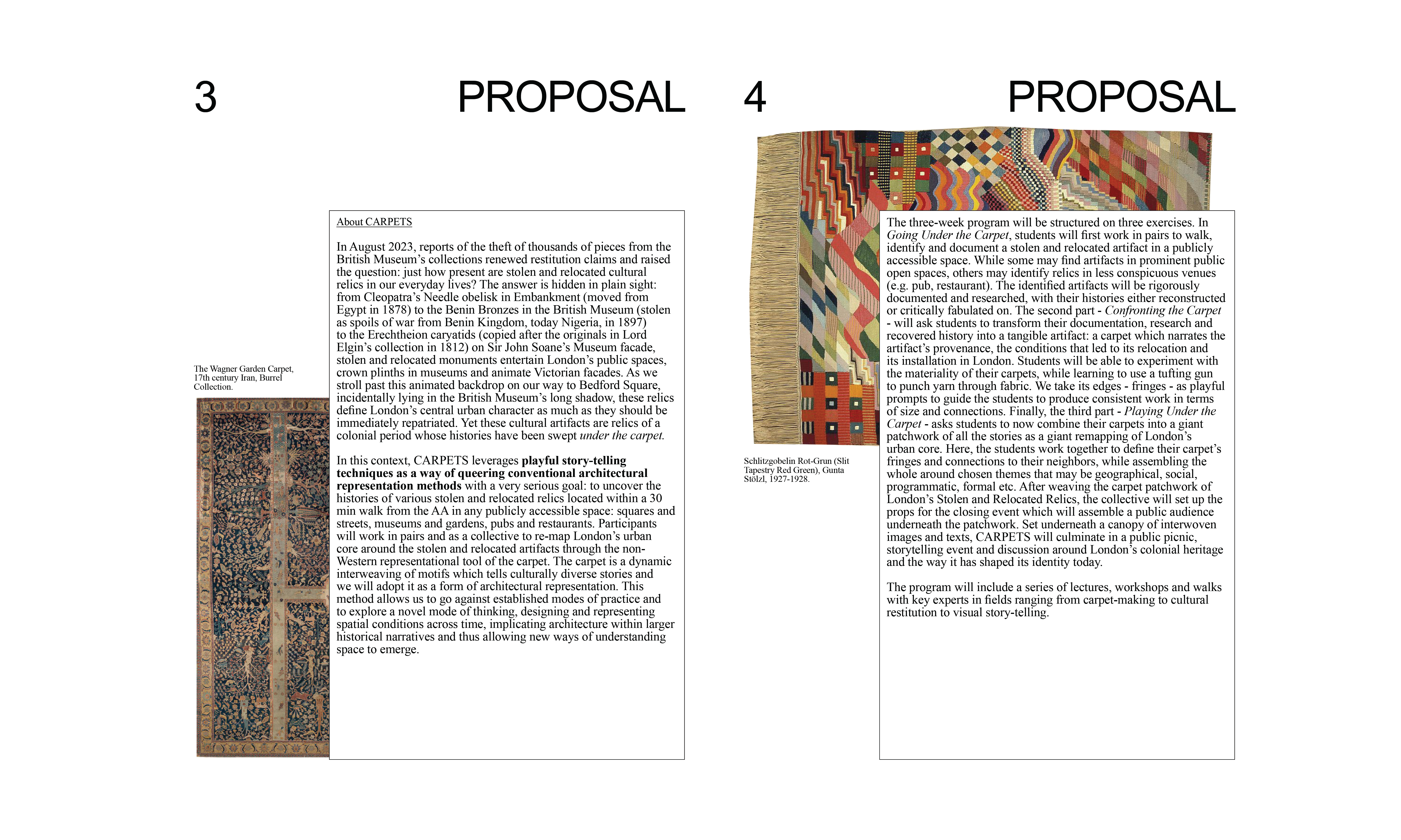 As part of the 2024 Architectural Association Summer School, I co-taught the unit CARPETS with Radu Remus Macovei and Edward Wang. The studio explored cultural artifacts as tools for historical reconstruction and representation, focusing on displacedmonuments within London’s urban fabric. Students identified stolen or relocated monuments and developed textile-based design interventions, using storytelling and memory to reimagine cultural identity through non-Western forms of architectural expression.