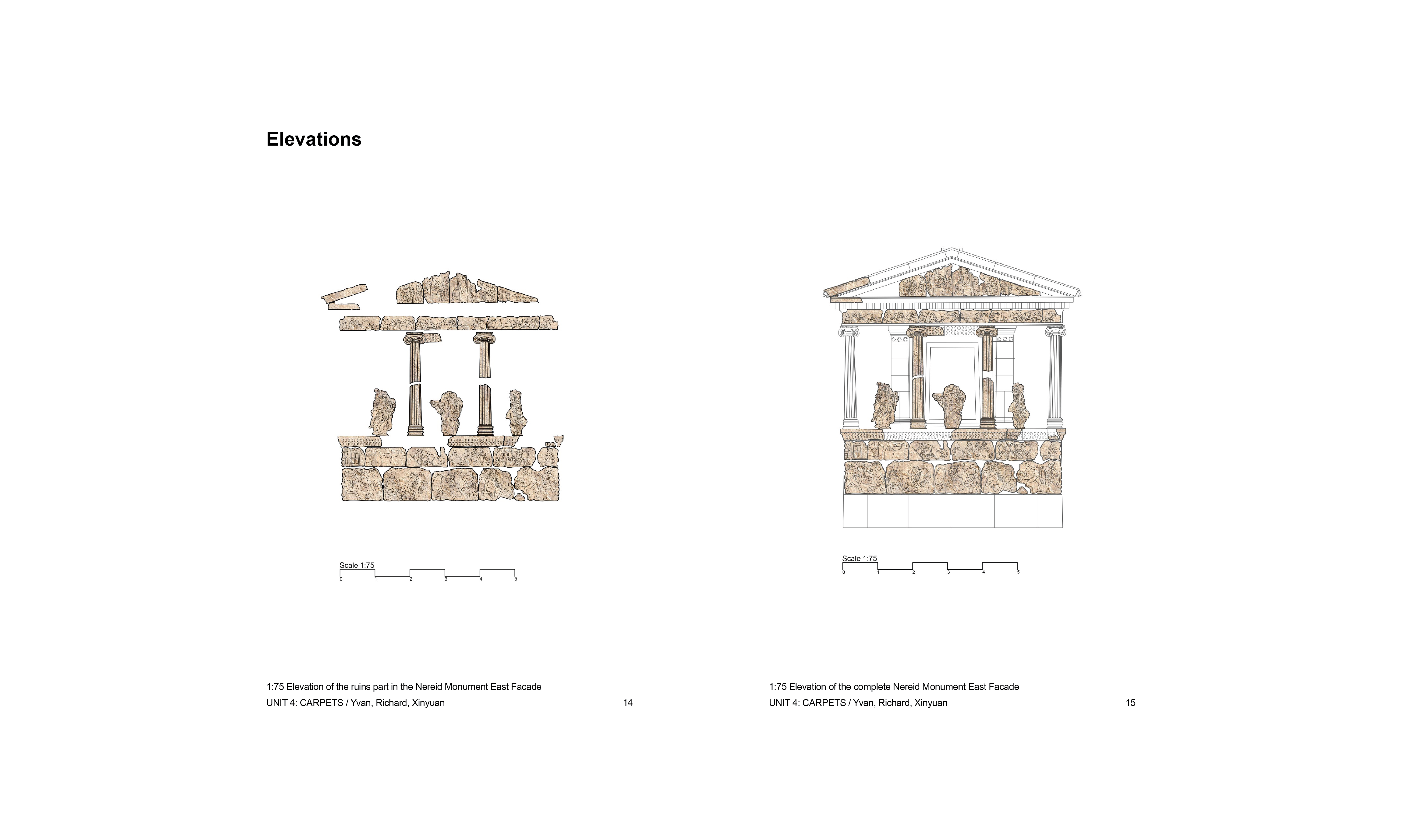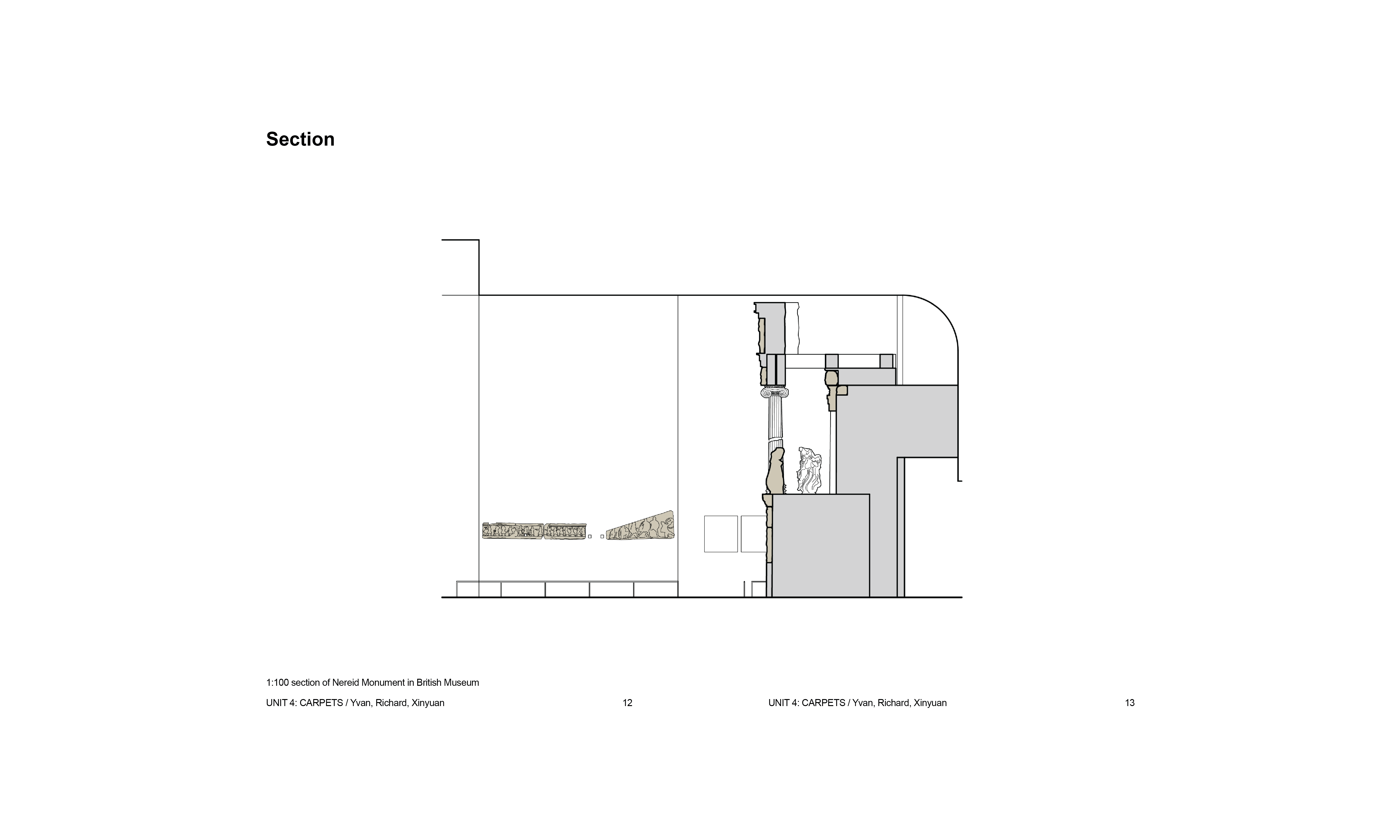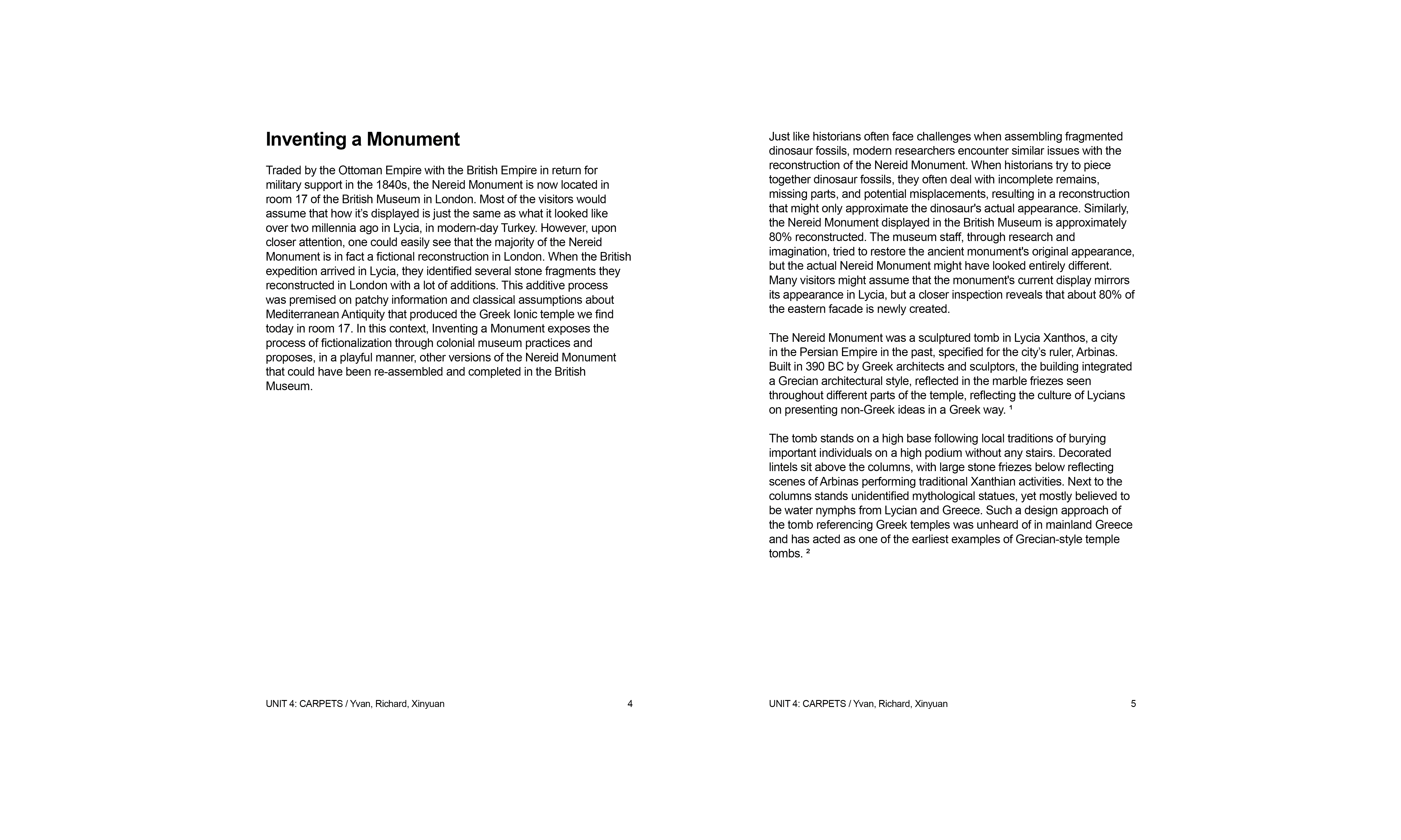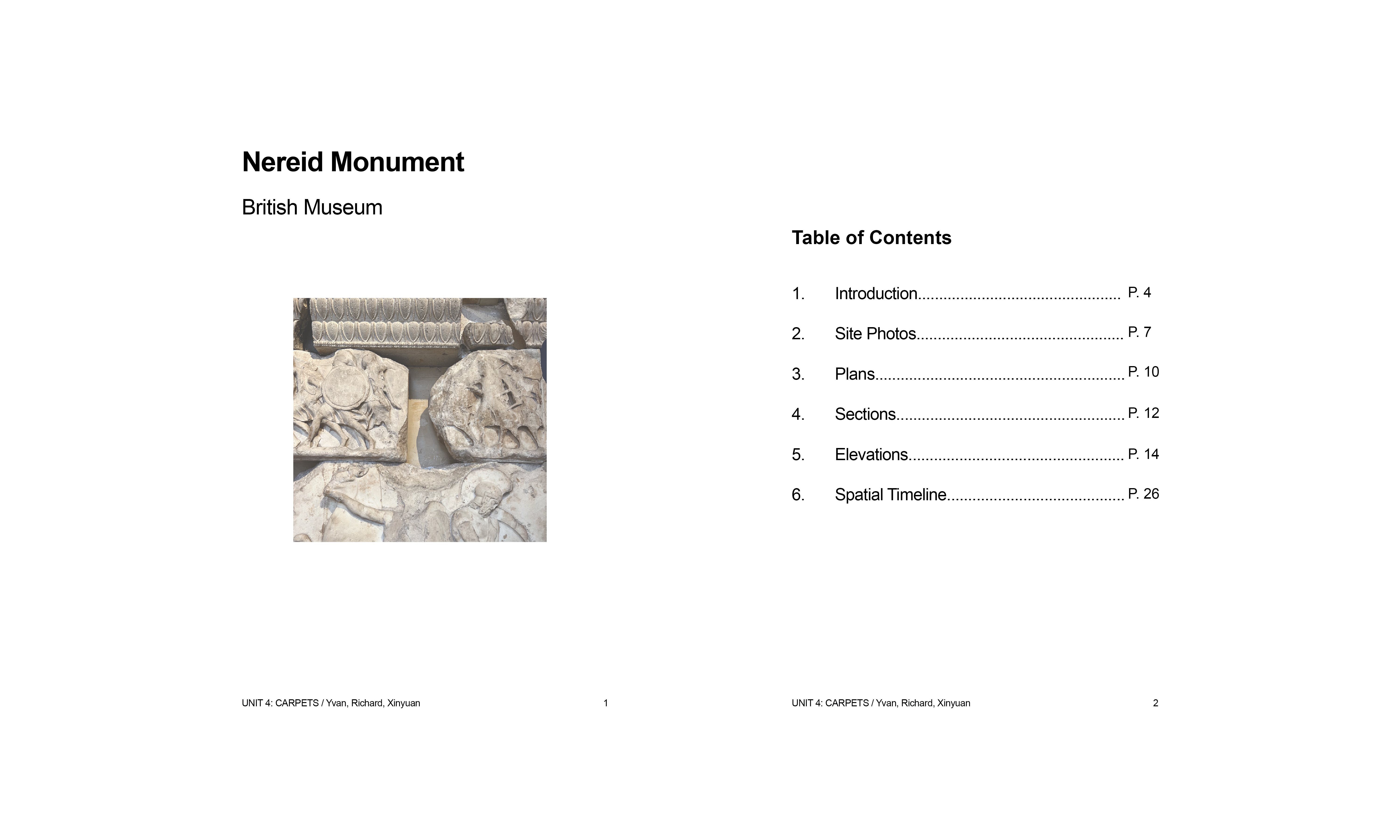 As part of the 2024 AA Summer School unit Carpets, this project examined the Nereid Monument — an ancient Lycian tomb now prominently reconstructed and displayed at the British Museum. Through critical analysis and spatial reconstructions, the students exposed how the current display is largely a fictional assembly shaped by 19th-century colonial assumptions and incomplete archaeological evidence. Drawing parallels with fossil reconstruction, the project highlighted the speculative nature of the monument’s presentation, revealing that approximately 80% of its eastern façadeis a modern invention. Using alternative architectural proposals, the project challenged conventional museum narratives and proposed new ways of seeing and situating displaced monuments.